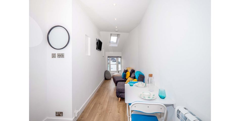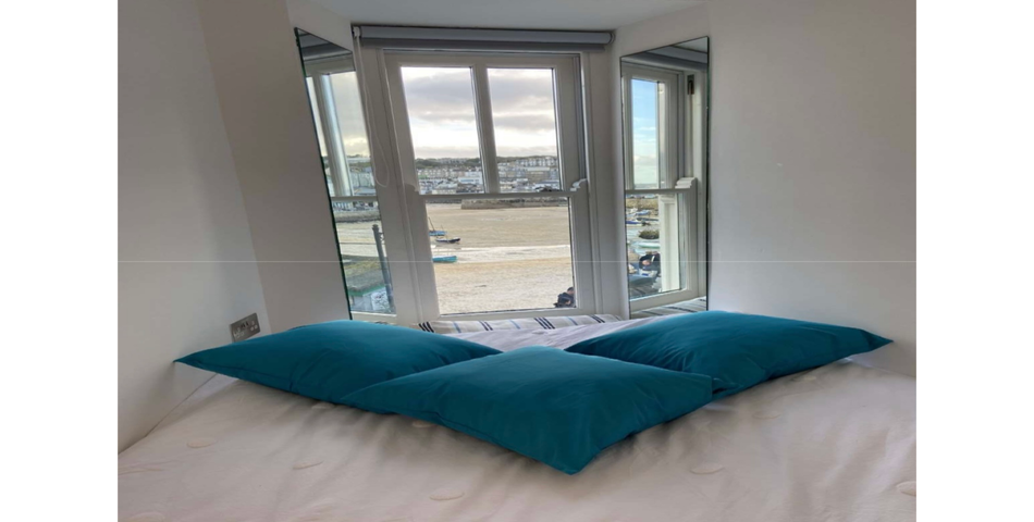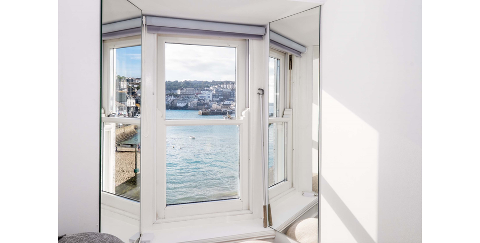 Stairs rise from the hallway to the open-plan upper floor, which includes a modern, well-equipped kitchen with integrated appliances, dining area, and comfortable living space. A double-glazed sash window frames spectacular views of St Ives harbour and the bay beyond, bringing the outside in.