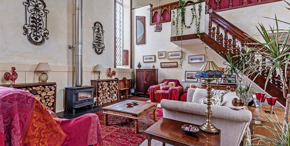 The former chapel has original features throughout, including latticed arched windows, stained glass and original wooden double doors into the entrance hall.