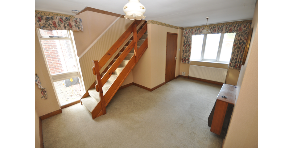Front UPVC double glazed window and side facing single glazed window. Fireplace with gas fire. Radiator. Staircase leading to the first floor.