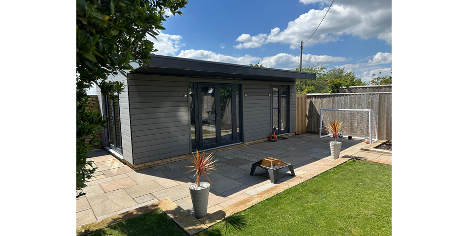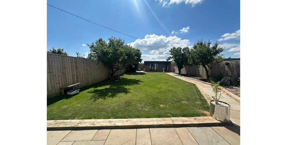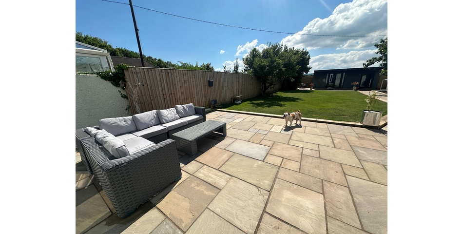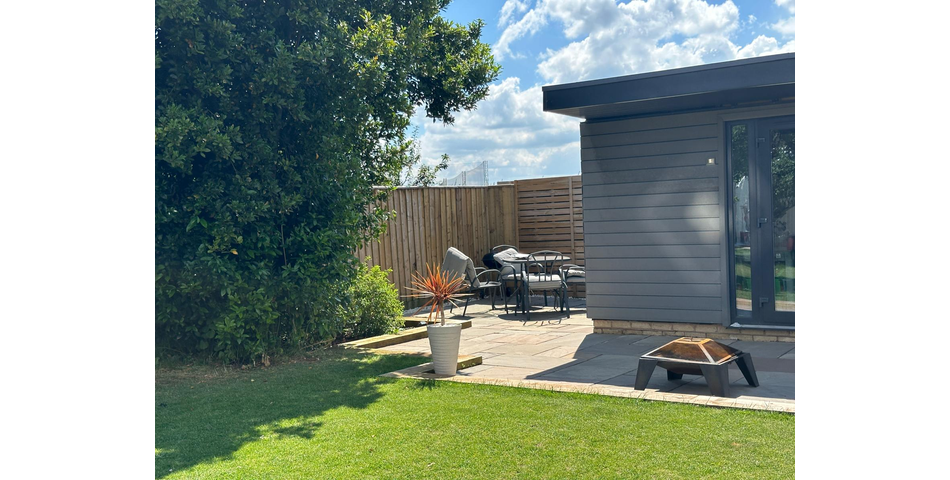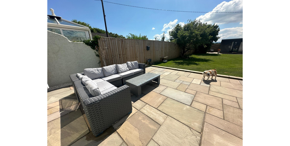 Outside: Nicely landscaped, private & south facing with a very large attractively paved patio across the rear leading to an expanse of lawn. A footpath, in the same stone, runs down the garden, beside are some small fruit trees; to a further patio and a large, modern cabin, built to a high standard in modern grey UPVC & currently divided into 2 separate rooms. A hidden storage area beside the cabin.